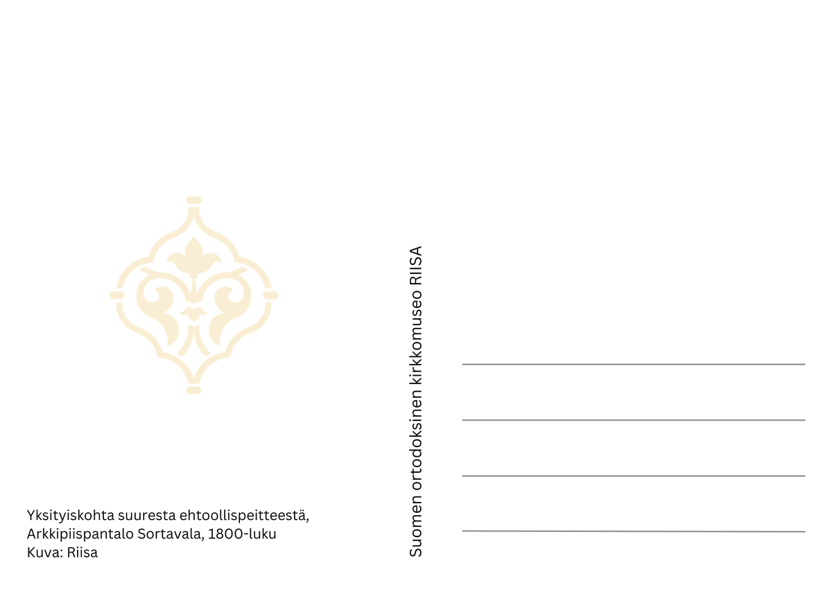 Postikortti, jossa yksityiskohta Riisan kokoelmiin kuuluvasta suuresta ehtoollispeitteestä, Arkkipiispantalo Sortavala, 1800-luvulta.