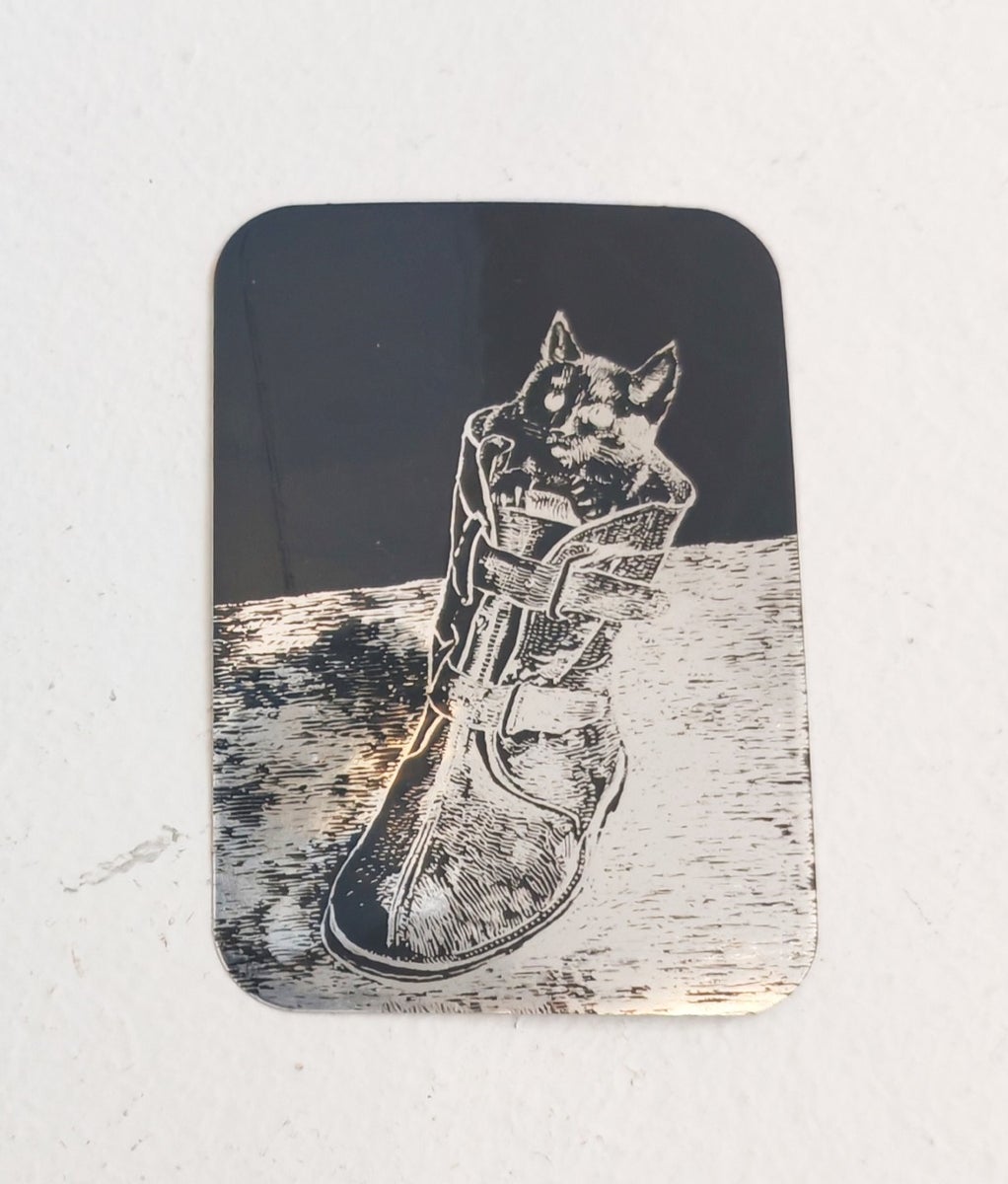 Kiiltävä Kissa saappassa -tarra. Suunnittelija: Hanneriina Moisseinen.