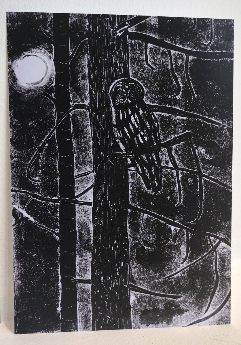 Pöllö ja kuu -postikortti/printti. Kortin koko A5. Suunnittelija Hanneriina Moisseinen.