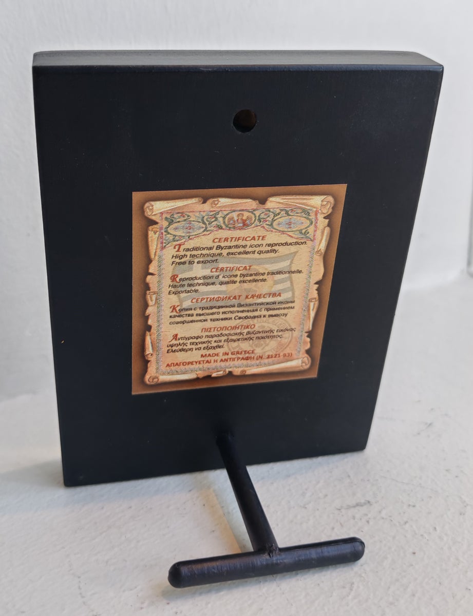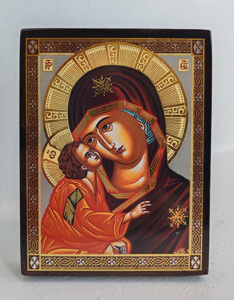 Ikoni vladimirin Jumalanäiti kultaisin ja hopeisin koristein. Painokuvaikoni puulle. Koko n. 9 x 12 x 1,6 cm. Ikoni pysyy pystyssä ilman tukea, mukana myös tukijalka, takana reikä seinään ripustamista varten. Valmistettu Kreikassa.